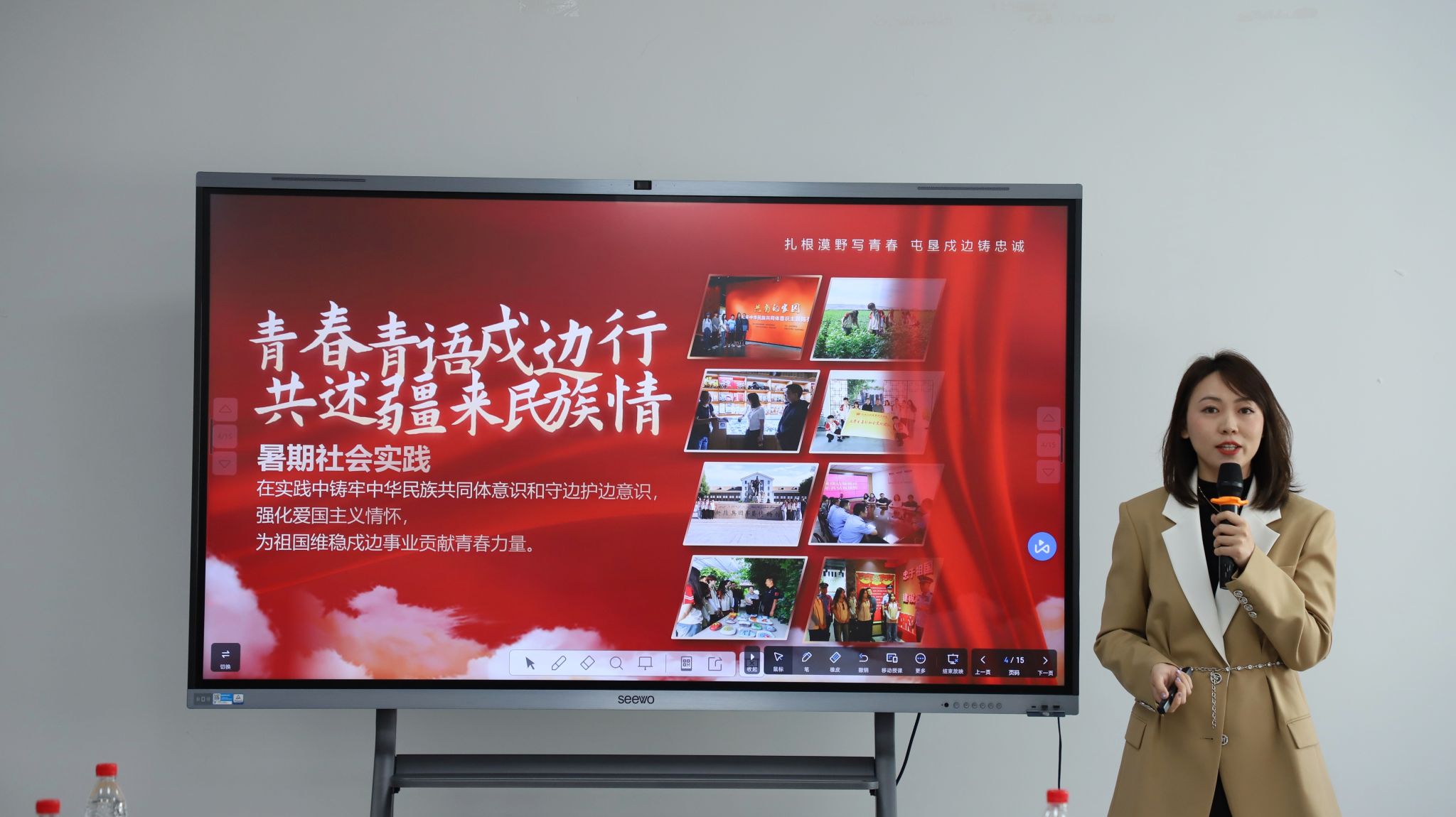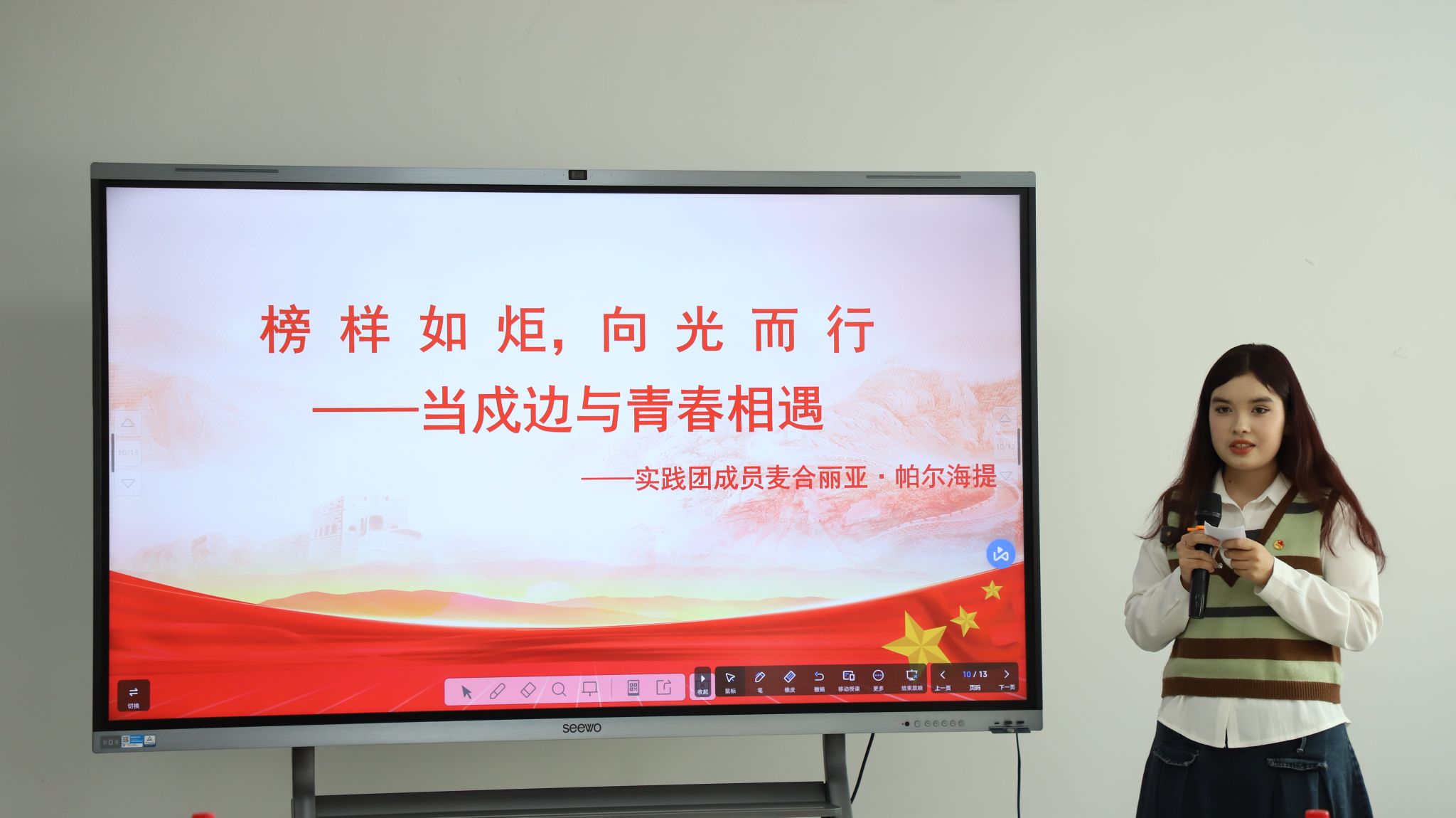 “青言青语戍边行,共述‘疆’来民族情”青马实践团的成员们通过视频展示、故事分享、连线采访等方式向现场同学们分享了实践成果和实践感悟,尤其是现场连线戍边民警——伊犁边境管理支队洪海沟边境警务站站长赵晨,他在新疆察布查尔锡伯自治县边境线上分享了自己在戍边过程中的难忘经历,从艰苦的戍边环境到坚定的爱国情怀,每一个故事都深深地打动、感染着在场的同学们。