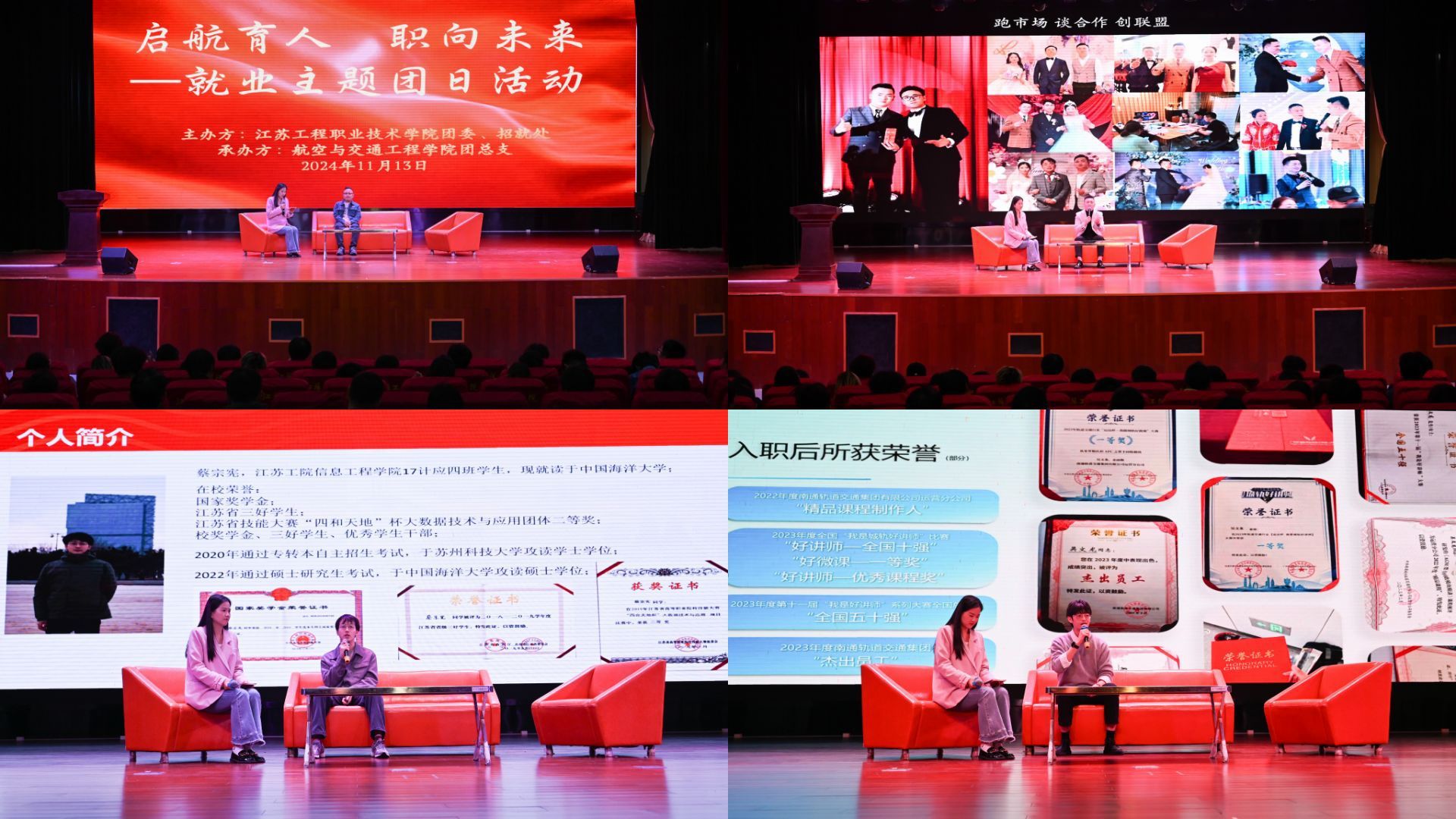 11月13日,由校团委、招就处主办,经济管理学院、航空与交通工程学院以及学院关工委承办的就业主题团日活动分别在崇川和海门两校区举行。校团委书记徐磊、马克思主义学院党总支书记钱晋、教务处副处长曹留峰(主持工作)、张謇创新创业学院副院长王小红(主持工作)、经济管理学院党总支副书记王谦、经济管理学院关工委陈蓉芳、就业指导中心吴云霞出席崇川校区活动,海门港新区包场镇党委组织委员黄庆、海门校区管委会主任于镇洲、航空与交通工程学院党总支书记曹钰、校团委副书记沈雯出席海门校区活动,两校区近1000名学生参加了本次活动。