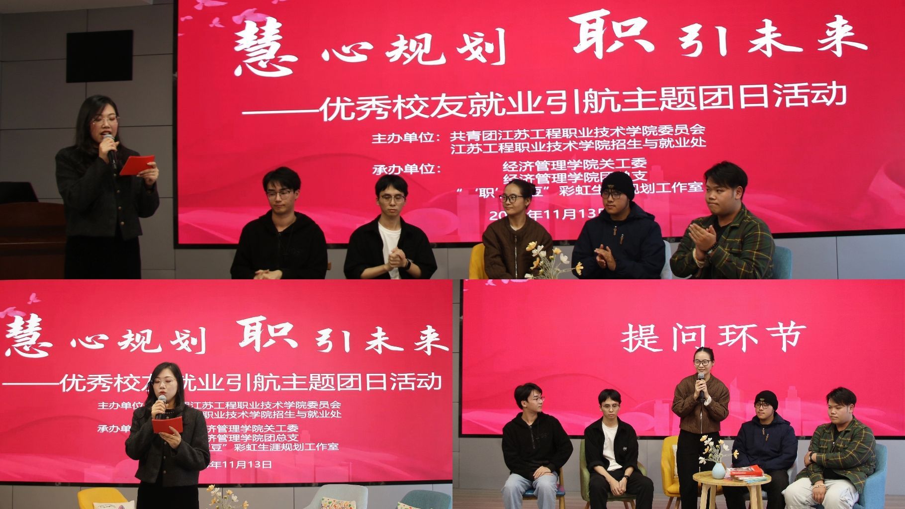 活动邀请了7个二级学院9位优秀毕业生分别作为基层、创业、考研、就业典型分享他们的成长故事。经验分享环节,基层代表、海门街道三南村定制村干、经济管理学院20电商四班毕业生杨镇华,海门港新区包场村、包新街区党总支副书记、建筑工程学院13工程造价班毕业生张佼结合自己的基层工作经历,与同学们交流了作为乡村振兴基层建设者的成长感悟;万言摄影工作室创始人、视觉中国签约摄影师、艺术工程学院21艺设三六班毕业生方謇文,万言摄影工作室合伙人、视觉中国签约摄影师、21艺设一班毕业生倪黄鑫,原力主持工作室联合创始人、智能制造学院20机电五六班毕业生李猛作为创业代表介绍了创业政策,分享了创业途中的宝贵经验;安徽科技工程大学研究生、经济管理学院18营销二班毕业生徐沈伟,中国海洋大学研究生、信息工程学院17计应四班毕业生蔡宗宪介绍了自己的学习经历和转本考研的上岸秘诀;普米斯生物制药(南通)有限公司微生物副主管、纺织服装学院13工分班毕业生朱亚楠,南通轨道交通集团有限公司运营分公司AFC中央维护员、航空与交通工程学院18城轨机电班毕业生吴文龙讲述了自己的成长路径以及新时代大学生素质提升方法,号召同学们找到人生方向,明确奋斗目标,认真做好学业规划和职业生涯规划,勇于突破舒适圈,不断扩大自我能力范畴,在奋斗中实现人生价值。