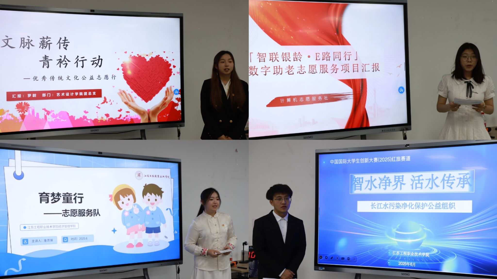 为全面贯彻落实习近平总书记关于青年工作的重要思想和志愿服务工作的系列重要指示批示精神,深入挖掘、培育、推广优秀青年志愿服务项目,更好动员引领全校广大青年志愿者为中国式现代化江苏新实践挺膺担当,6月4日下午,校团委在崇川校区一站式社区二楼功能室举办2025 年青年志愿服务项目大赛决赛。团市委社联(志工)部部长朱悦涵,校党委学工部部长徐明、招生就业处处长储玲、工会主席程莉、校团委书记徐磊出席活动并担任评委,来自各二级学院的8支参赛队伍以及师生代表参加了本次活动。