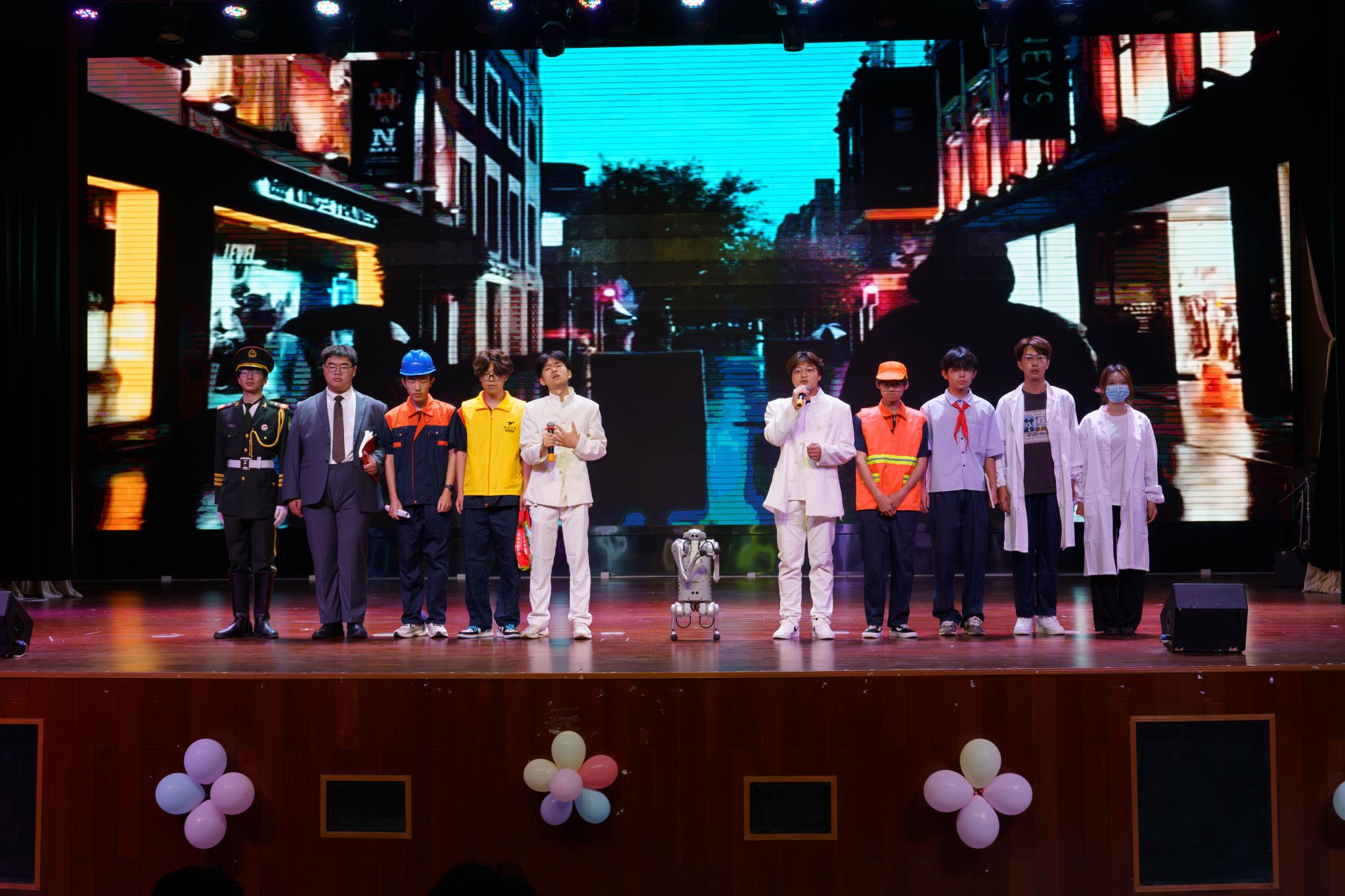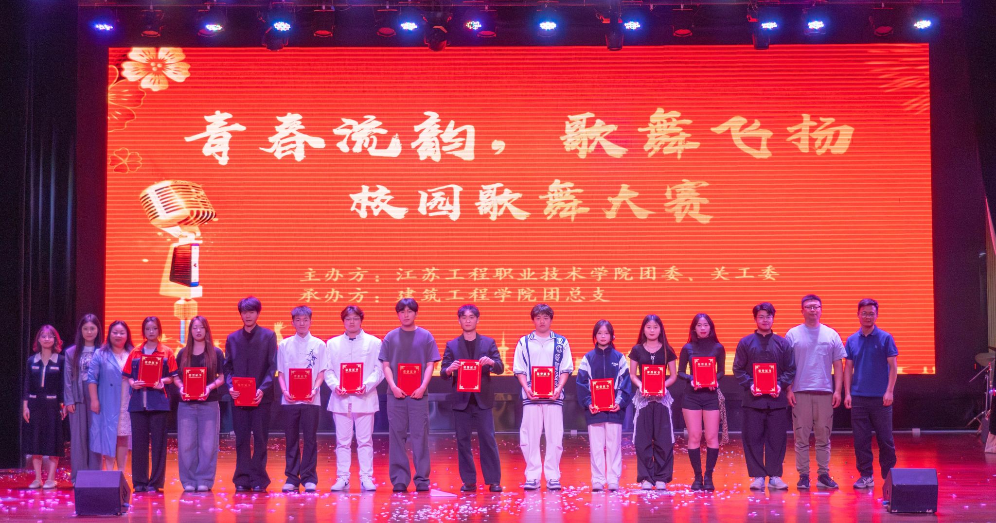 来自建筑工程学院、智能制造学院、航空交通学院的 12 支参赛队伍依次上台,围绕“青春”“爱国”“奋斗”等主题,呈现了题材多样、特色鲜明的歌舞节目。各学院参演学生用饱满的热情和精湛的表演,生动诠释了兼具思想性、艺术性与观赏性的歌舞作品,为现场观众带来沉浸式的青春与家国情怀体验。经过激烈角逐,航空交通学院选送的歌曲串烧《乐队汇演》和建筑工程学院选送的舞蹈《桃花朵朵开》荣获一等奖;智能制造学院选送的歌曲《无名的人》、舞蹈《大国工匠》、建筑工程学院选送的歌曲《无名的人》、舞蹈《画卷》荣获二等奖;建筑工程学院选送的歌曲《紫荆花盛开》、航空交通学院选送的歌曲《南山南》、舞蹈《forever young》《且听龙吟》和智能制造学院选送的歌曲《追风赶月的人》、舞蹈《太极》荣获三等奖。