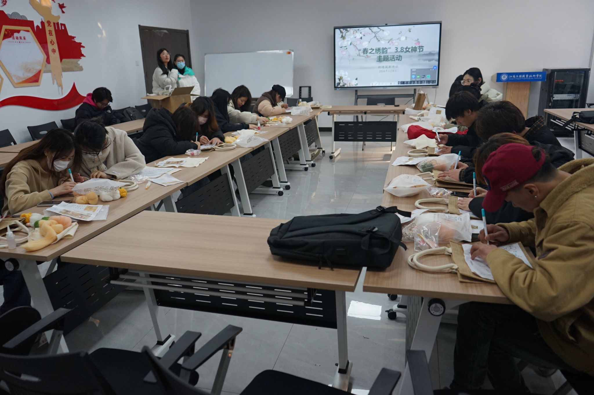 3月8日下午,织绣阁刺绣社团在一站式学生社区中心活动室举办“春之绣韵”3.8女神节主题活动,来自纺织服装学院、经济管理学院、艺术设计学院的26名社团成员参加了活动。