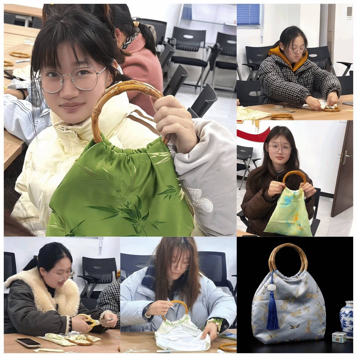 活动伊始,社团负责人细致讲解了竹节包的结构设计与制作流程。在随后的实践环节中,同学们化身巧手匠人,以面料、辅料为材,专注地进行选材、缝合、塑形与装饰。从细节打磨到整体成型,零散材料在大家手中逐渐变为一个个风格雅致、独一无二的竹节包。现场交流热烈,大家互鉴技巧,分享巧思。