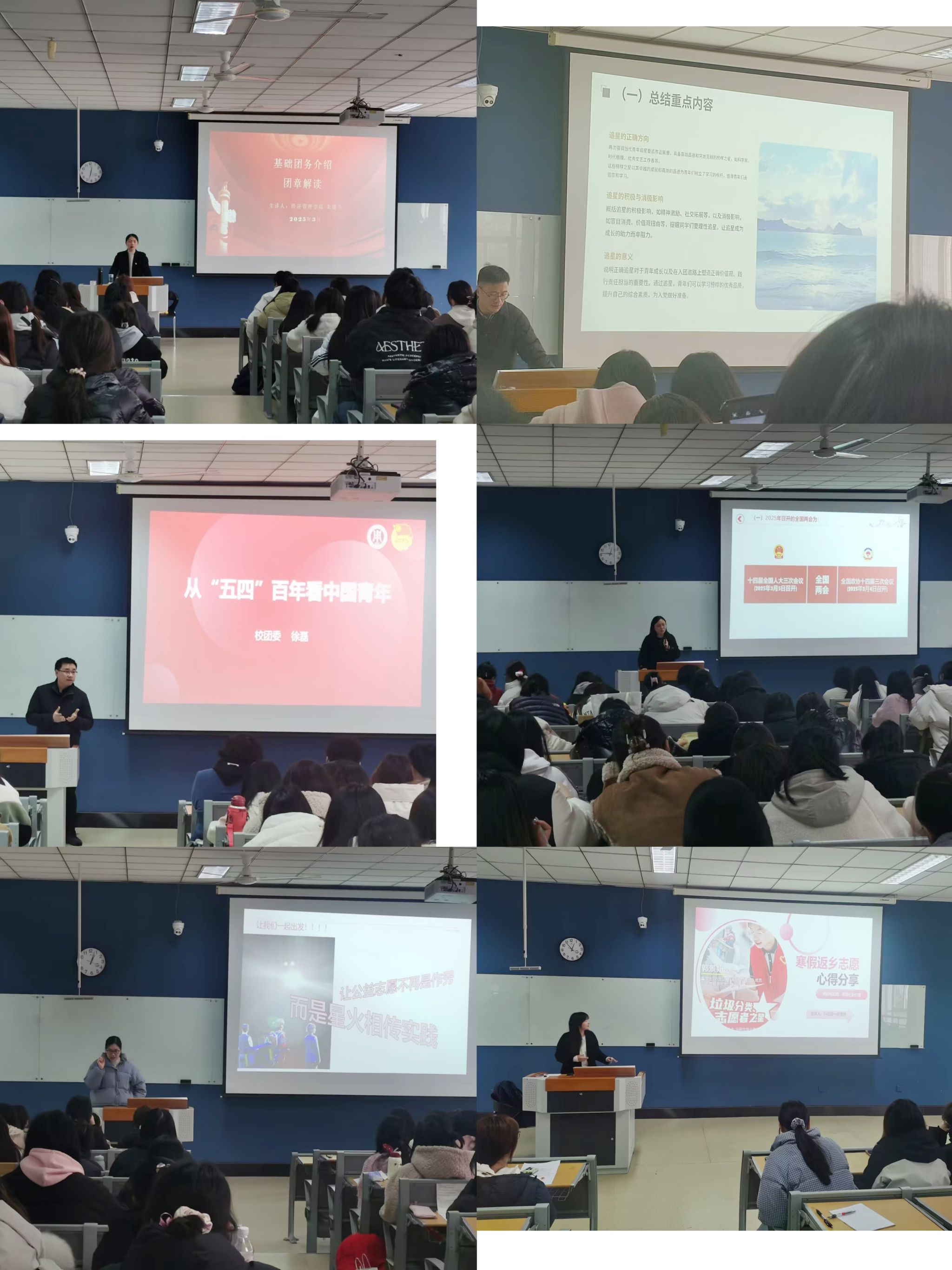 本次团校分为理论宣讲、实践拓展和结业考试三部分。徐磊以“从‘五四’百年看中国青年”为主题,带领同学们回顾“五四”百年来中国青年的勇敢担当和辉煌成就,激励广大青年勇担新使命,在新征程上奋勇向前,争做新时代好青年。魏银霞以“学习两会精神,争做有为青年”为主题,带领同学们学习两会精神,坚定理想信念,探讨了作为新时代大学生如何为全面建成社会主义现代化强国、全面推进中华民族伟大复兴而团结奋斗。王谦以“当代青年到底应该追什么样的星”为主题,引导同学们建立良好的榜样意识,树立正确的价值观。朱建兰详细介绍了基础团务知识,带领同学们学习团章,加强青年大学生意识形态教育。在实践环节,李慧娴带领各小组同学围绕“青年志愿服务”主题进行志愿服务汇报,号召青年投身志愿服务,彰显担当。