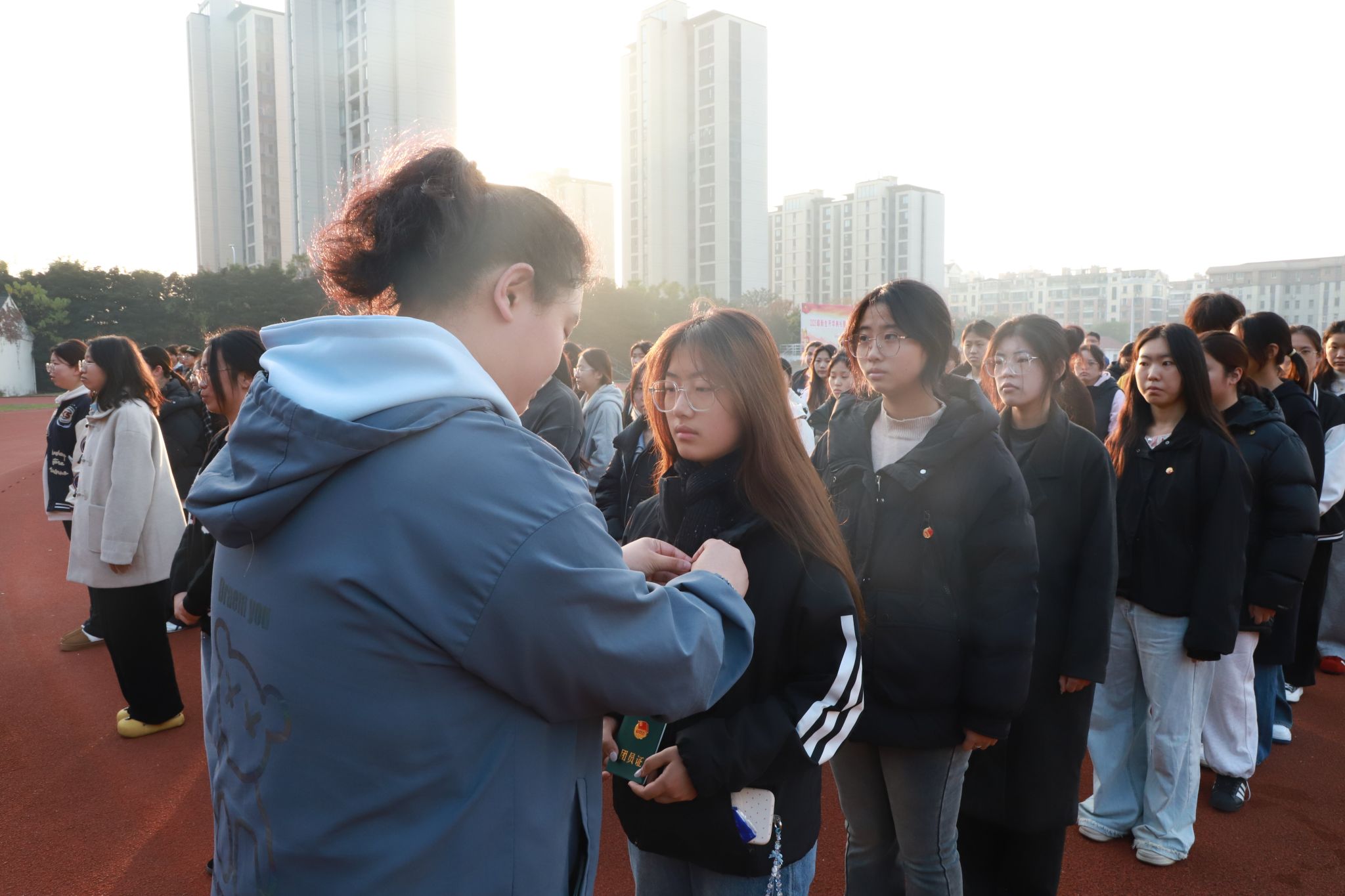 在庄严的国歌声中,活动帷幕徐徐拉开。护旗队迈着整齐的步伐护送国旗入场,全体师生肃立行注目礼,鲜艳的五星红旗在朝阳中冉冉升起。随后,彭钰舒带领新团员宣誓,他们面向团旗,右手握拳,庄严承诺:“我志愿加入中国共产主义青年团,坚决拥护中国共产党的领导……”铿锵的誓言响彻校园,展现了新时代青年听党话、跟党走的坚定信念。接着老团员代表为新团员佩戴团徽,发放团员证。小小的团徽别在胸前,不仅是一份荣誉的象征,更代表着一份沉甸甸的责任。新团员代表产翠芳表示将用实际行动践行入团誓词,努力学习、服务同学,为团组织增光添彩。最后,朱建兰勉励新团员们要牢记“请党放心,强国有我”的青春誓言,将理想信念内化于心、外化于行,以昂扬的姿态高扬理想风帆,在投身建设祖国、服务社会的伟大征程中勇当先锋,大有作为。
