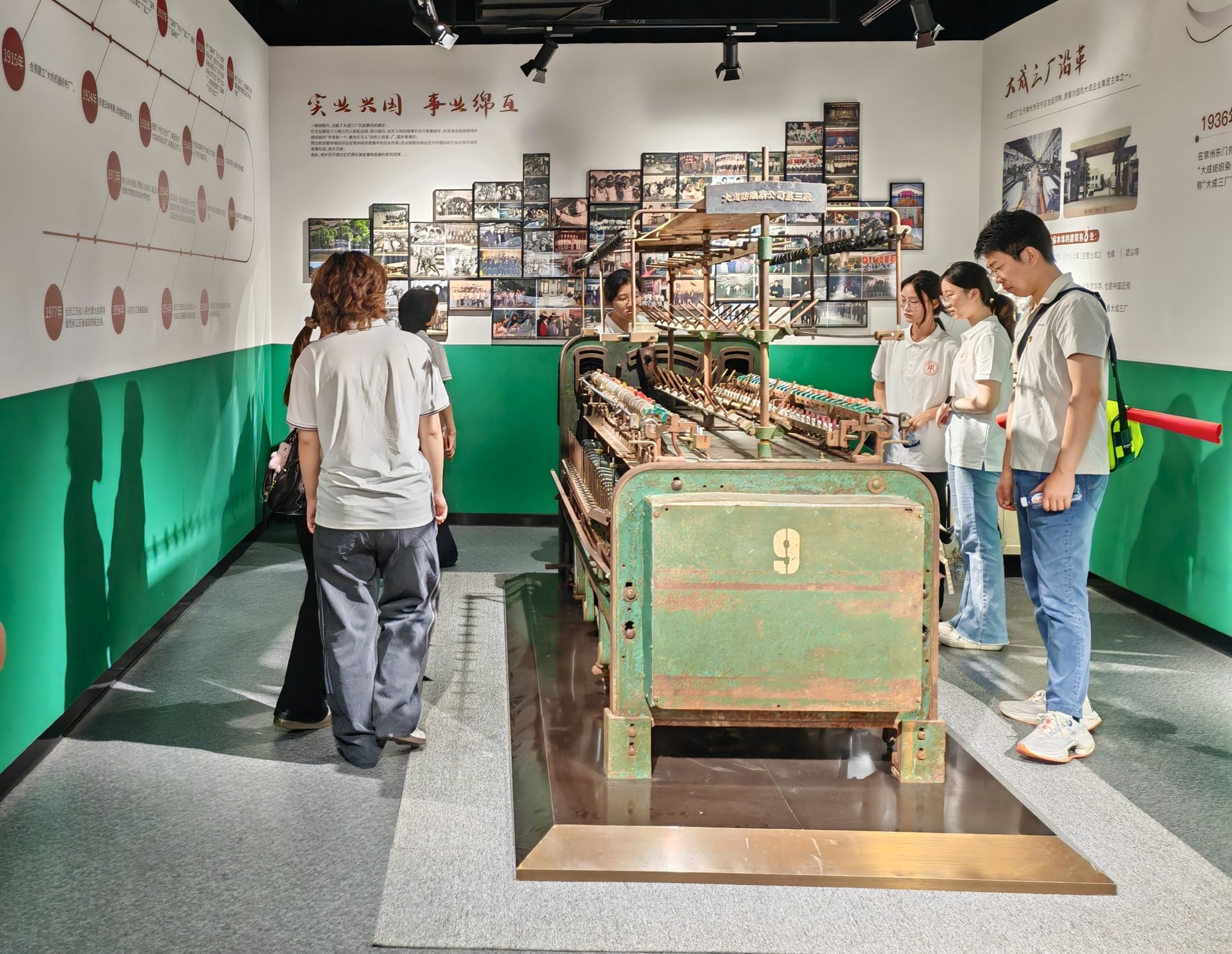 7月22日,实践团走进大成三厂织布车间旧址(现常州纺织博物馆)、大明纱厂旧址(现常州天虹纺织有限公司)等地,开启了一场穿越时空的红色工业之旅。在复原的历史车间里,展柜中褪色的照片和泛黄的档案默默陈列着,每一张影像、每一页纸片都在无声地讲述着那段“纱线救国”的烽火岁月;环锭细纱机与梳棉机等工业遗存静静矗立着,磨损的齿轮和锈迹斑斑的支架诉说着当年工人们前赴后继、夜以继日、战天斗地的爱国故事。当实践团成员们轻轻抚过这些饱经沧桑的机器时,大家触摸到的不仅是冰凉的金属,更是一代代纺织工人用生命铸就的热血丰碑。实践团成员冒宗妍感慨,这些机器会老化生锈,但是工人们“织布为战”的精神永不褪色。江苏省五一劳动奖章获得者、学院杰出校友韩梁,如今在常州天虹纺织有限公司担任总经理助理,她向同学们详细介绍了大明纱厂变革和发展的历程,她特别提到,从战时的旧机器生产到现在的智能化车间,变的只是生产方式,不变的是纺织人产业报国的初心,她勉励同学们要传承这份“经纬精神”,在新时代续写中国纺织业的辉煌篇章。