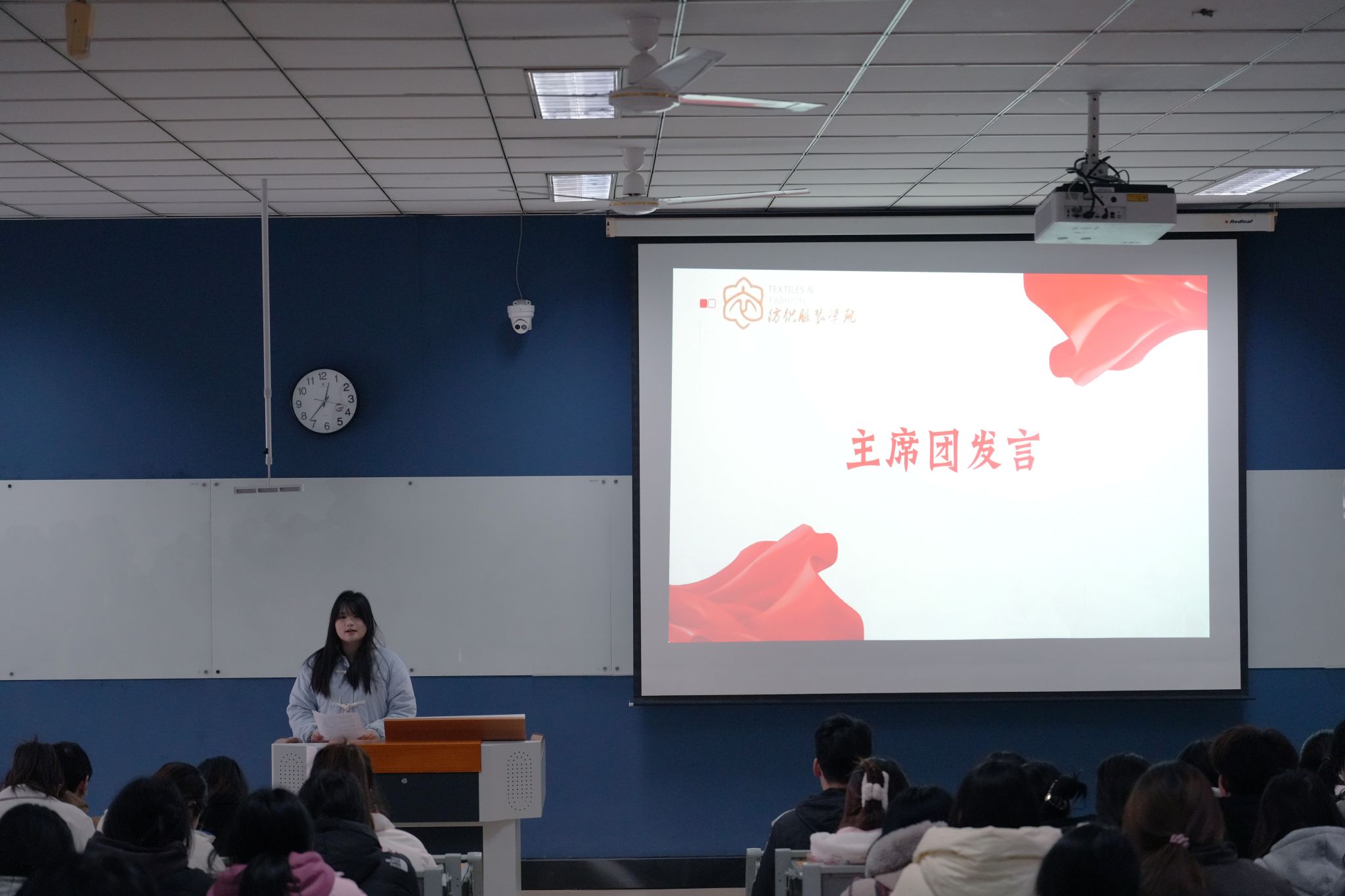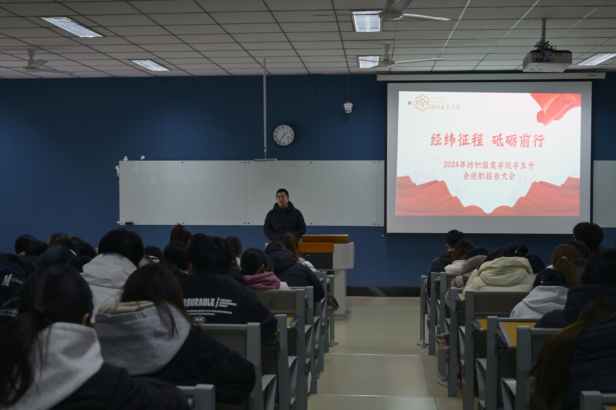 1月3日,纺织服装学院学生分会在致知楼220举办述职评议会。学院党总支副书记刘桂阳、团总支书记、学生分会秘书长周星星、团总支副书记孟诗凯以及全体学生分会成员、各班级学生代表200余人参加了本次会议。