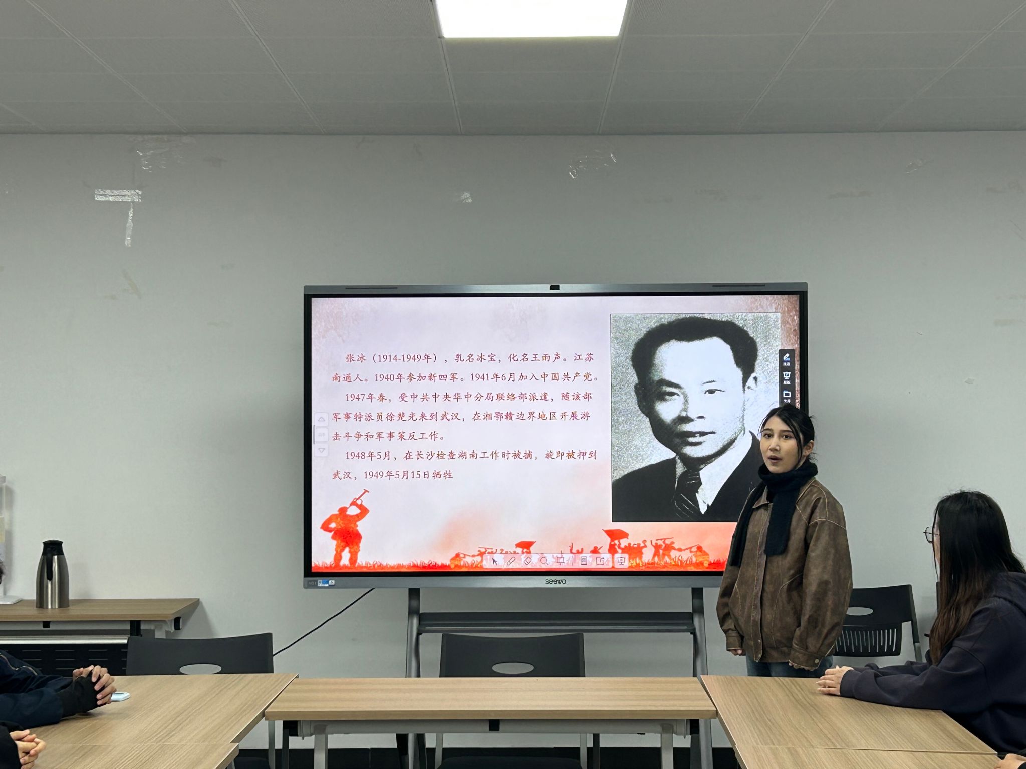 祭扫活动结束后,学生们来到崇川校区一站式学生社区二楼党建多功能活动室开展学习交流分享会。学生代表周怡馨、阿丽耶·玉散分享了两位南通籍烈士的生平事迹,并表示现如今祖国的繁荣昌盛离不开这些革命烈士们英勇无畏的牺牲精神,作为新时代青年,需以烈士精神为明灯,在求学路上勤勉奋进,在社会实践中勇担使命。分享会的最后,孟诗凯勉励大家要传承好革命先烈们顽强拼搏的精神,挺膺担当、奋发向上。