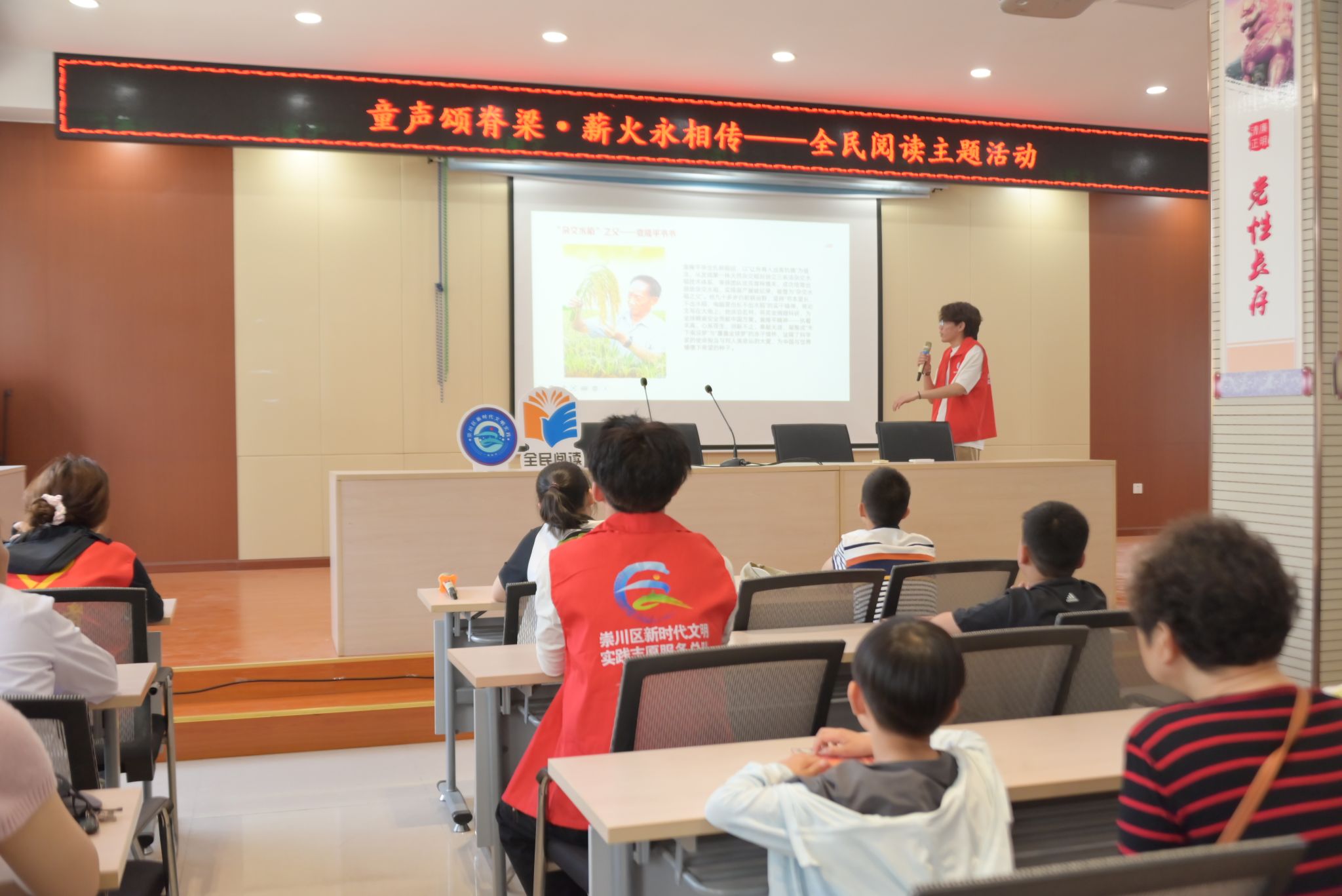 活动过程中,在纺织服装学院四名学生志愿者的带领下,果园村社区的少年儿童共读《国之脊梁》。书中钱学森、袁隆平、张桂梅等杰出人物的事迹,在孩子们稚嫩而坚定的声音中焕发新生。志愿者们通过“故事领读+角色扮演”的创新形式,将“两弹一星”元勋的报国壮举、杂交水稻之父的躬耕岁月、时代楷模的奉献精神转化为生动的课堂场景。孩子们或化身“小科学家”演绎科研突破,或化身“小记者”采访英雄事迹,现场掌声与欢呼声此起彼伏。