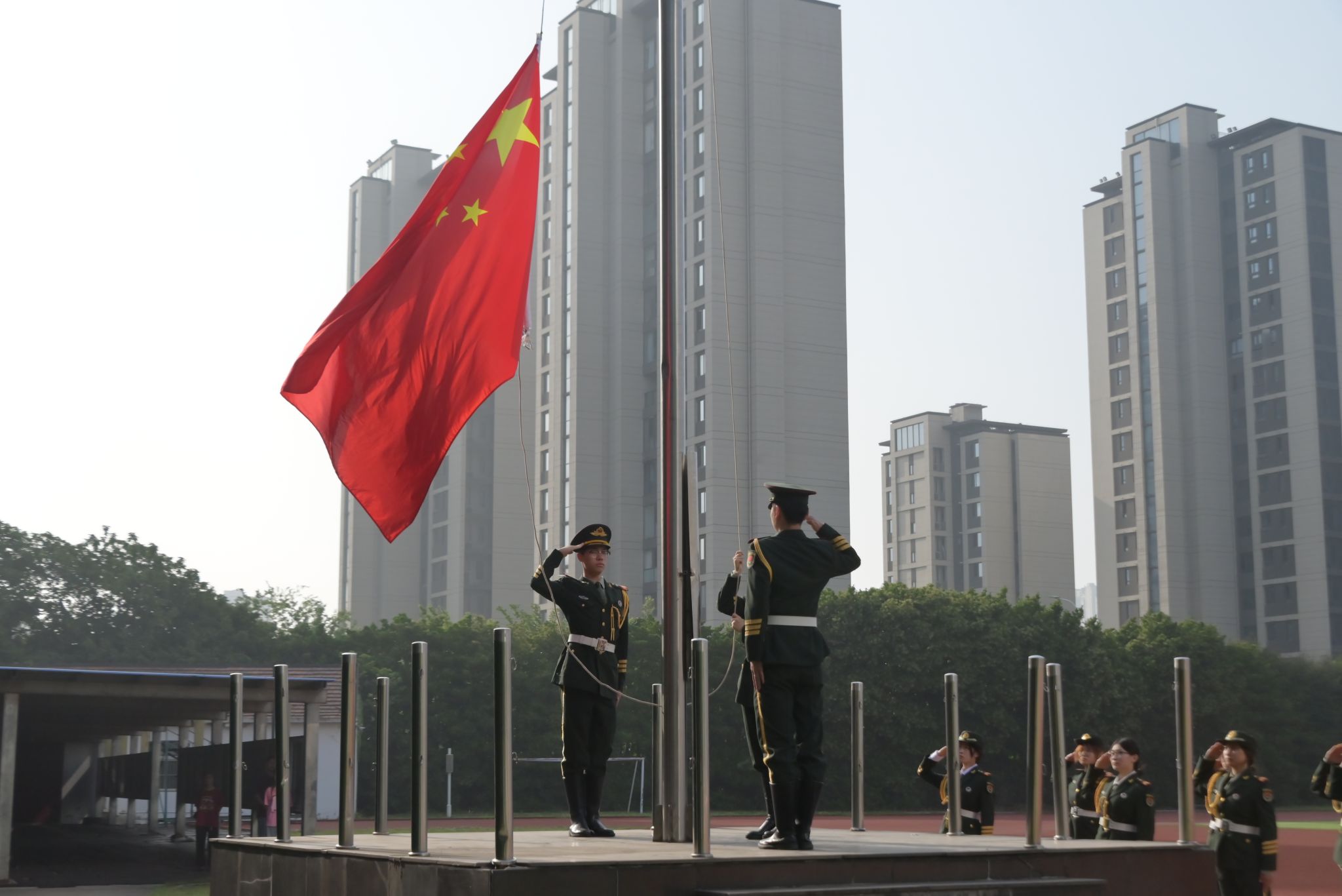 随着激昂的《义勇军进行曲》奏响,升旗手振臂一挥,鲜艳的五星红旗迎着朝阳冉冉升起。全体人员神情庄重,面向国旗行注目礼,高唱国歌,歌声嘹亮,响彻校园。
