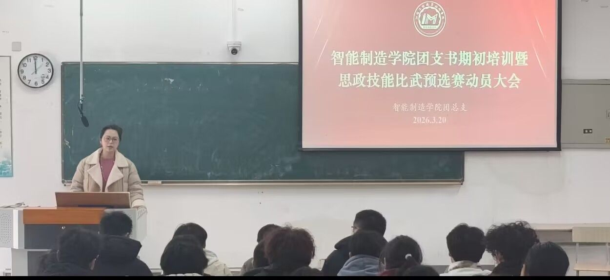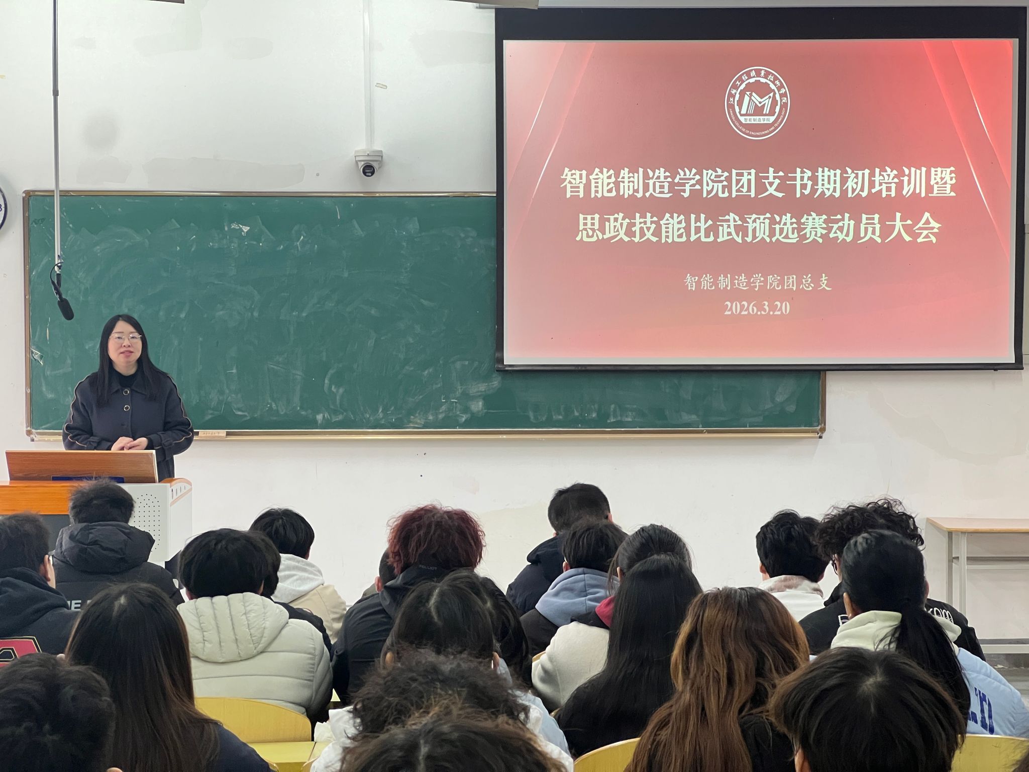 为强化基层团干部政治素养与履职能力,扎实推进团员教育管理与思政育人工作,3月20日中午,智能制造学院召开团支书培训暨思政技能大比武动员大会。党总支书记白林讲授理论学习“开学第一课”,团总支负责人保钰作工作部署,全院各班团支部书记及支部代表参会。