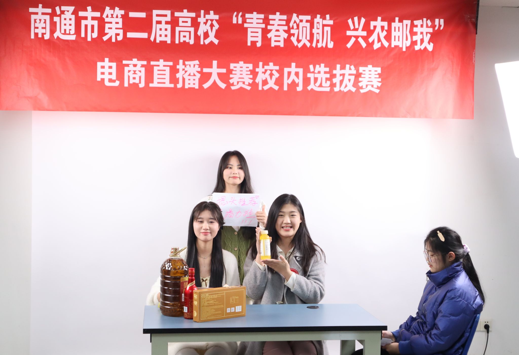 3月28日,由校团委主办、经济管理学院承办的南通市第二届高校“青春领航 兴农邮我”电商直播大赛校内选拔赛在致知楼503举行。基础教学部党总支书记顾晓梅、校团委副书记张禧嘉、经管学院电子商务教研室主任肖琦、基础教学部应用汉语教研室主任夏蕾、双创实践中心主任石慧担任评委。