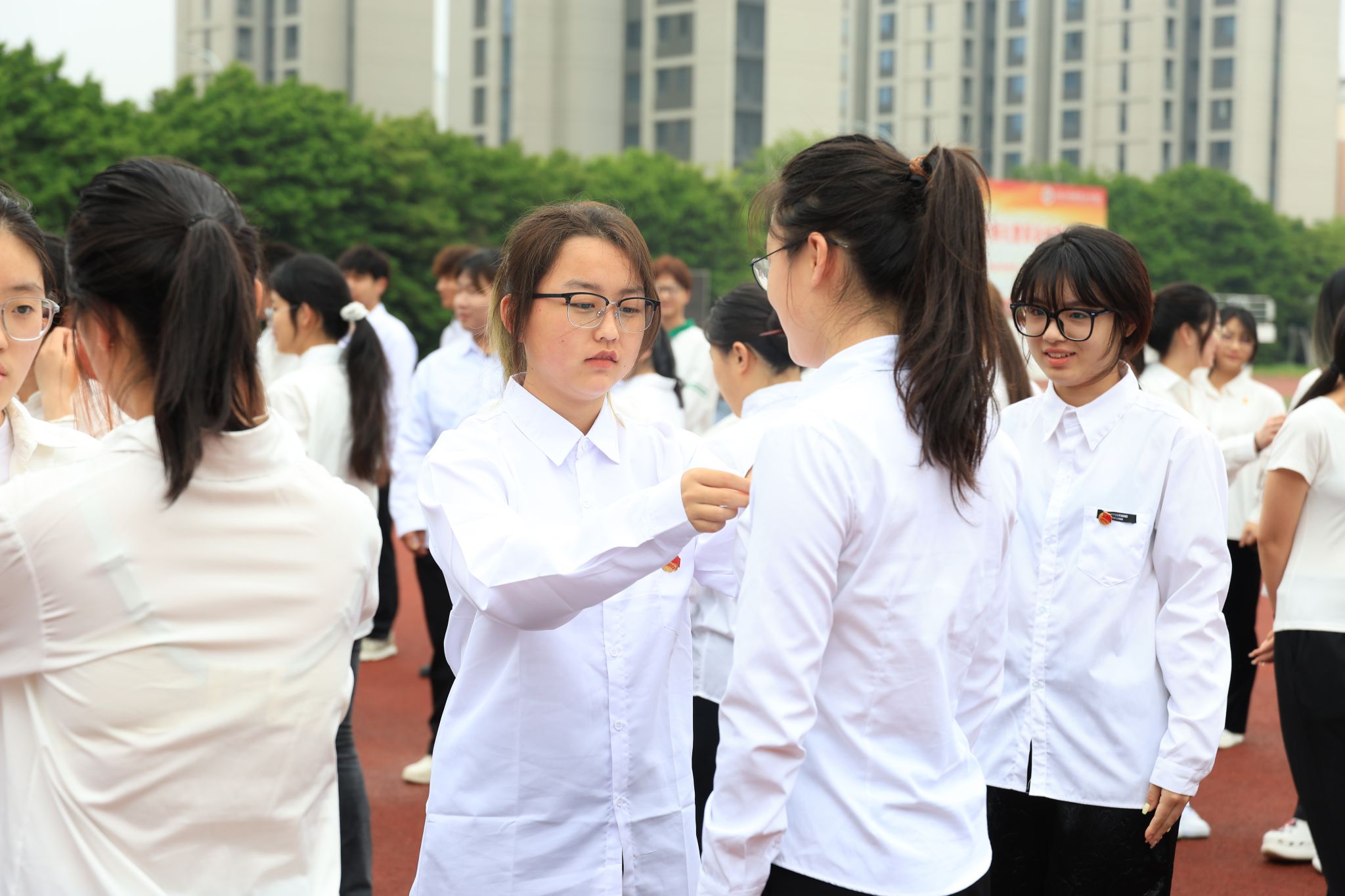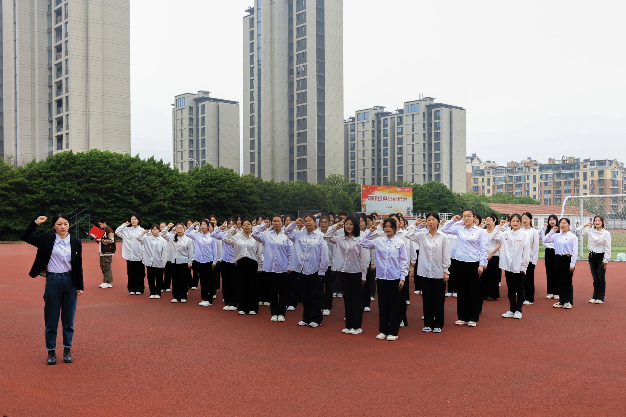 仪式在庄严的国歌声中拉开帷幕,全体师生肃立,向冉冉升起的五星红旗行注目礼。入团仪式正式开始,全体新团员面向团旗,齐唱团歌,整理团徽。激扬的团歌与胸前闪闪的团徽,不仅代表着共青团员的光荣身份,也承载着团员的担当与责任。接着,全体新团员在朱建兰的带领下,右手握拳,手举过肩,面向团旗庄严宣誓。铮铮誓言汇聚成一股强劲的青春力量,响彻操场。最后,朱建兰勉励新团员们坚定理想信念,珍惜时光,勤奋学习,全面发展,以实际行动践行团员职责,为共产主义事业奋斗。