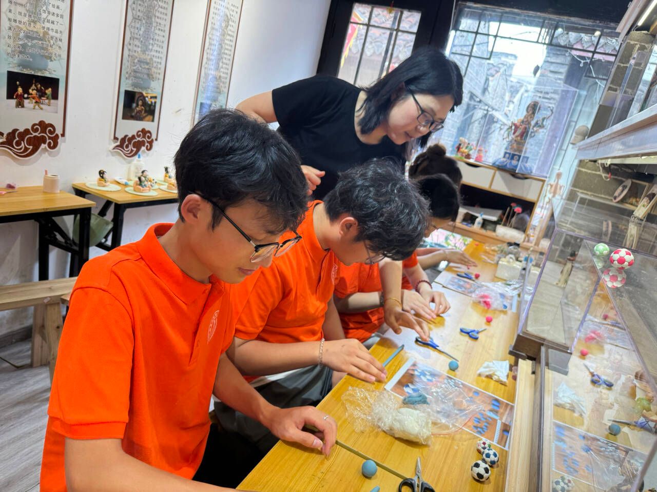 如皋面塑的第六代非遗传承人蔡晓霞是一名80后,受祖辈熏陶,打小就酷爱面塑等传统文化。在访谈中,蔡老师向团队成员详细介绍了如皋面塑的历史渊源、文化背景、技艺特点与制作流程。在蔡老师的悉心指导下,团队成员们不仅克服了起初手法的生疏,还随着老师的细致讲解和自身的不断领悟,逐渐将手中的面团塑造成了一个个形态逼真的足球作品。