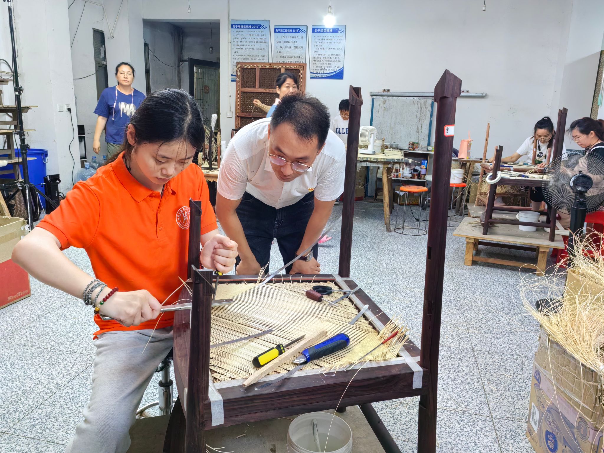 探访当天,肖老师向团队成员分享了自己学艺成长的故事,带领大家参观了肖记藤制品厂生产线。团队成员在体验湿棕绳穿网和编藤后不禁感叹道:“藤编技艺既是力气活,也是精细活,要向手艺人致敬。”当团队成员问到关于藤编手艺传承与发展时,肖老师表示只要有人愿意学,他就愿意教,希望大家学到一技之长,通过手艺致富,这是藤编手艺的魅力,也是他守艺的价值所在。