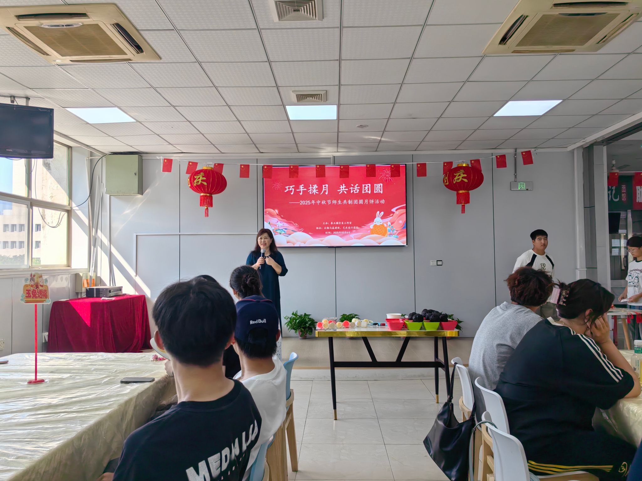 在等待烤月饼的间隙,猜谜游戏火热开启。谜题内容涵盖诗词典故、校园地标、生活常识等多元主题。当同学成功破解谜题时,现场即刻爆发出热烈掌声;而当出现令人忍俊不禁的趣味答案时,全场又会漾起善意的笑声,此起彼伏的互动声浪与烤箱中飘出的饼香交织,将原本的等待时间转化为充满文化趣味与青春活力的互动场景。
