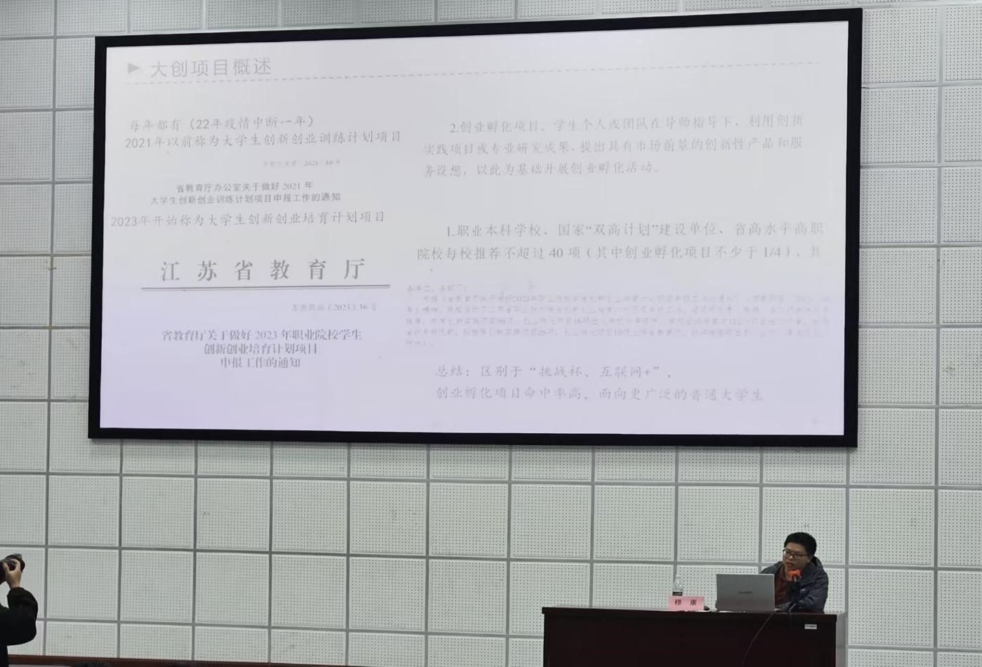 首先,穆康从自己参加创新创业大赛的经验出发,详细讲解了大创项目概述、申报动机、如何选题、案例分析和项目实施要点等五个方面内容。盛俞杰同学分享了他在江苏省第十八届“振兴杯”全国青年职业技能大赛中的成功经历,他表示,创新创业需要具备团队合作和坚持不懈的精神,同时需要不断地学习和提升自己的能力。