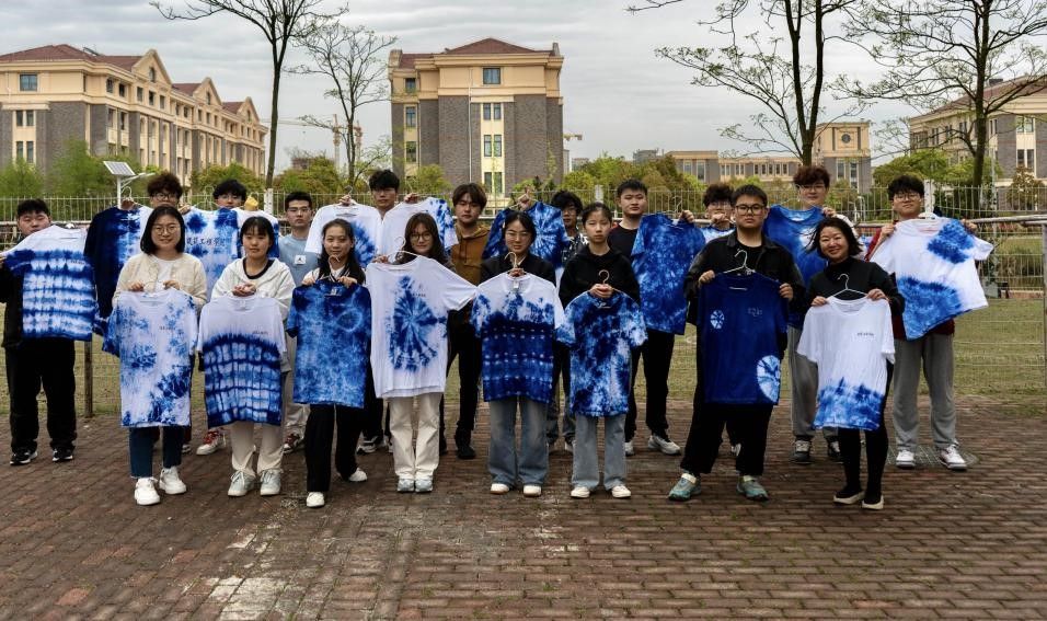 活动中,高月梅详细讲解了扎染技术的历史渊源、制作流程和注意事项,让大家对扎染这一古老的染色技艺有了更为全面的认识和了解。在高老师的指导下,同学们纷纷动手尝试,逐渐掌握了扎染的基本步骤和技巧。同学们在方阵服装上进行设计,从圆形扎法、斜线扎法、螺旋扎法等各种方法捆扎布料,到染料挑选,最后再到浸染、晾晒,每一个步骤都充满了挑战与乐趣。经过一个小时的动手制作,同学们完成了扎染作品,大家互相探讨交流着彼此的心得体会,在体验中感受到中国非物质文化遗产扩展项目扎染的独特魅力。
