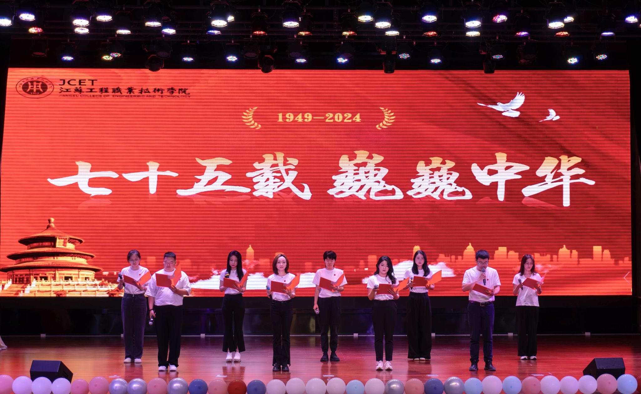 晚会分为“青春如火,灼耀前行”“舞美雅韵,家国恒爱”“青春燃梦,工院筑光”等三个篇章,以弘扬家国情怀为主线,同时融合青春活力元素,通过歌舞、合唱、情景剧、朗诵等丰富多样的艺术形式,为新生带来了一场视听文化盛宴。情境舞蹈《点点红》拉开了晚会的序幕,通过现代舞描绘了革命战争年代点点红色汇聚成燎原之势,点燃民众奋起抗争的决心与意志的情景;歌曲《重返17岁》充满了对校园和青春的美好幻想;小品《一起去旅行》诙谐幽默、贴合现实生活,引来观众的阵阵欢笑;舞蹈《巴啦啦小魔仙》展现了最火热的青春和最炙热的激情;歌曲《大鱼》优美轻快,唱出了青年学生对美好生活的向往;齐舞《骁》展现了中华儿女的豪情壮志;乐队歌曲《写给黄淮》唱出了对未来的憧憬和对理想的坚定;情景剧《钱学森》演绎了钱学森胸怀祖国人民、勇攀科学高峰的情节,生动展现了老一辈科学家用毕生经历所诠释的科学家精神;空乘礼仪表演《礼仪操》展示了空乘礼仪的独特魅力;歌曲联唱《那个远方》《有我》《奔跑》,以激昂的旋律和鼓舞人心的歌词,唱出了青年学生不畏艰难、勇往直前的精神。