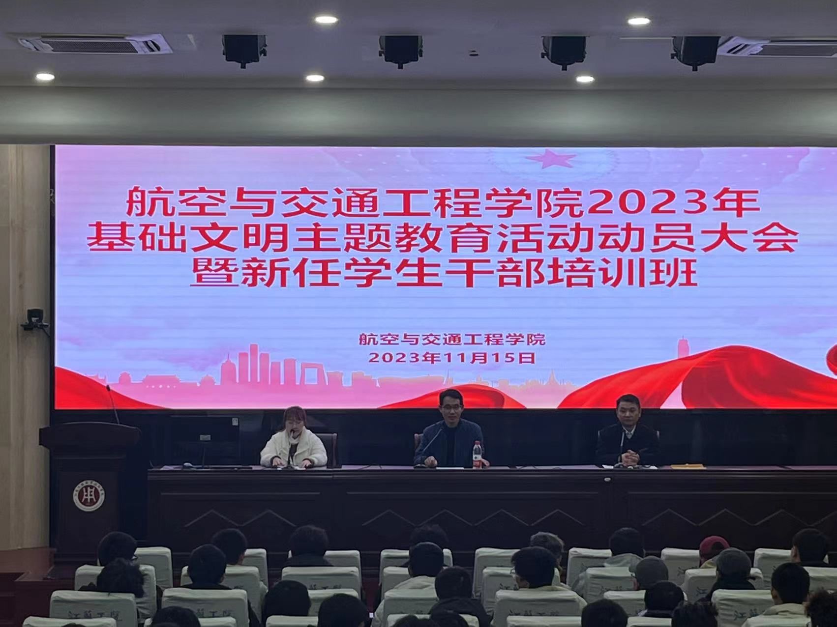 为深入贯彻“立德树人”根本任务,落实“三全”育人理念,提高学生的思想道德修养,弘扬中华美德,创建文明校园。11月15日晚,航空与交通工程学院在海门实训基地200人报告厅举行2023年基础文明主题教育活动动员大会暨新任学生干部培训班。航空与交通工程学院党总支书记曹钰、党总支副书记陈益飞、辅导员陶茜茜、23级各班班委及自管会学生干部参加了动员大会,大会由陶茜茜主持。